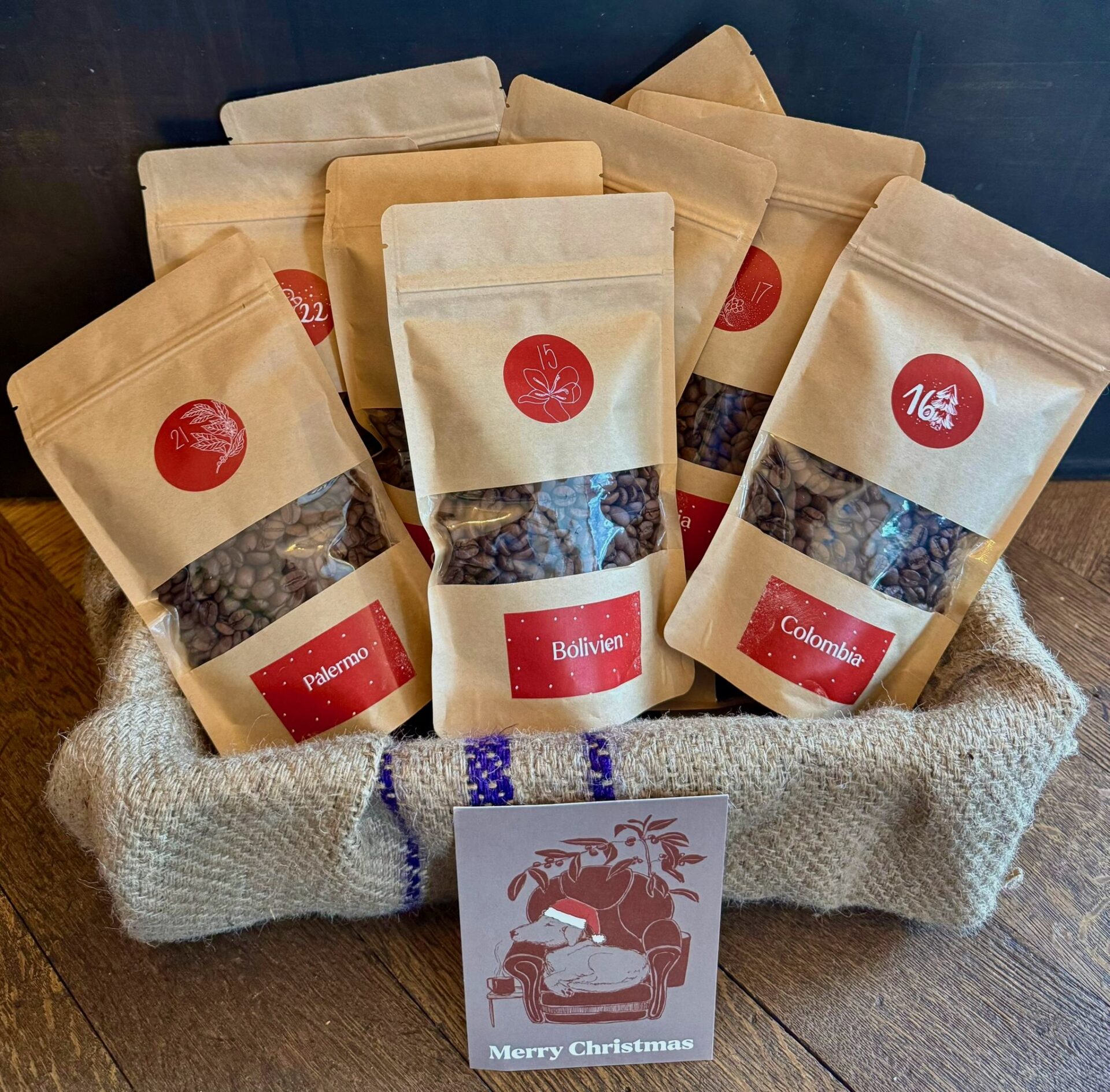 Unser neuer Kaffee Adventskalender ist da! 24x 100 Gramm Packungen mit Kaffeesorten aus aller Welt inkl. selbstgemalter Weihnachtskarte und dekorativem Kaffeesack.
