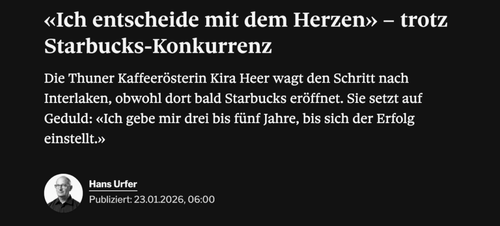 «Nein, Bauchschmerzen habe ich keine», sagt Kira Heer zur Konkurrenz durch das US-amerikanische Kaffeehaus-Unternehmen Starbucks. Dieses betreibt seit 2025 eine Filiale in Thun und wird im kommenden Frühling auch in Interlaken eröffnen – jeweils in unmittelbarer Nähe zu ihren Cafés.